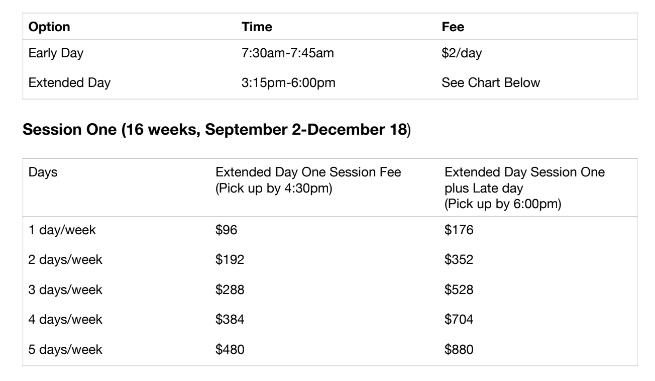 Payment for activity fees is due at the time of registration or can be added to enrollment agreement. All other charges will be added weekly, statements sent to families monthly. A $25 fee will be assessed each time a child is picked up after 6:00pm.